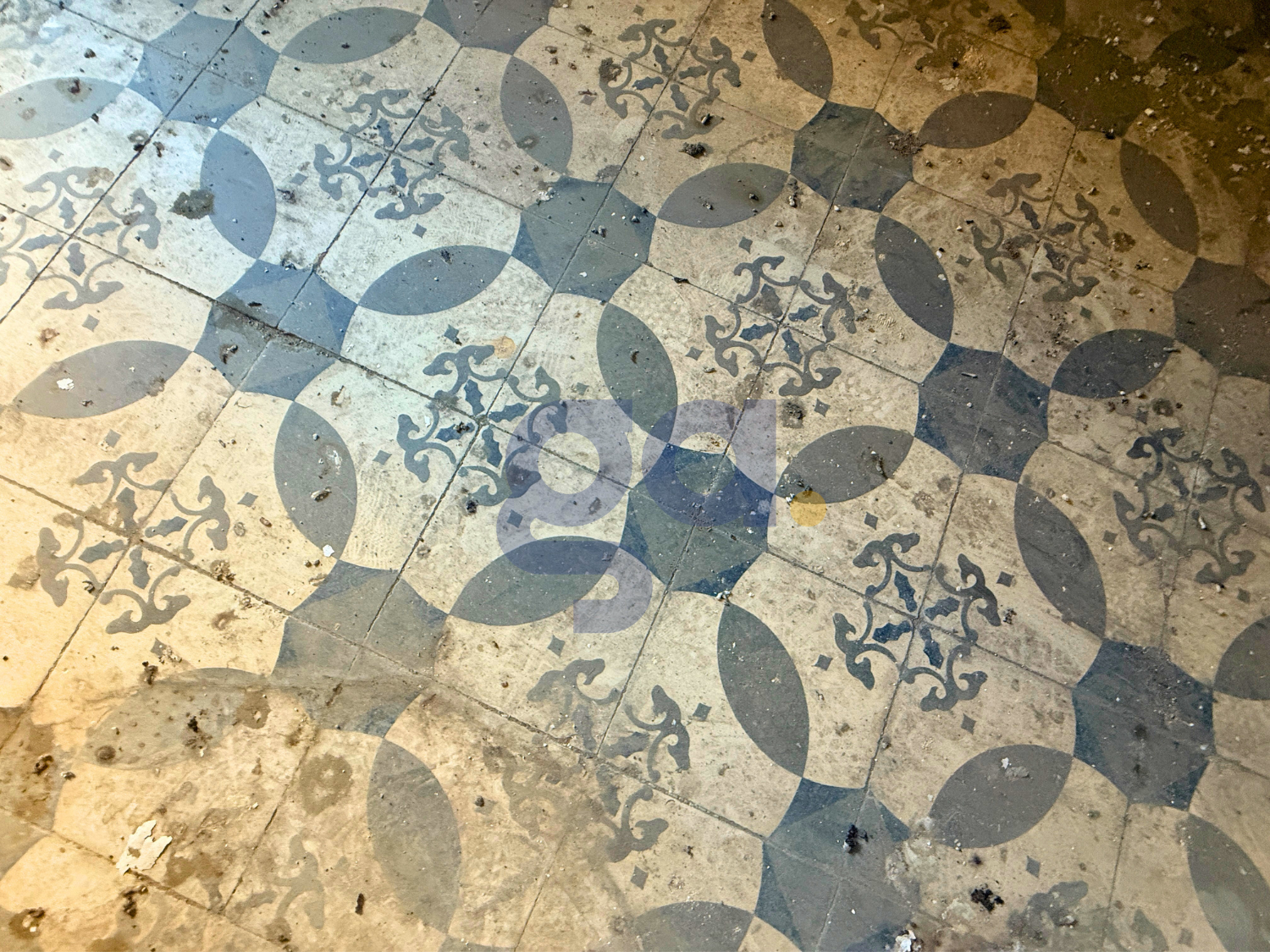 A pesar del estado de la vivienda, esta presenta algunos elementos con encanto, como su suelo hidráulico original, que podría ser rescatado e integrado como guiño a la historia del inmueble.